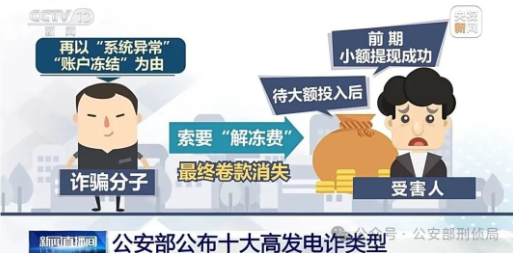 诈骗分子先伪装成投资导师或婚恋对象,通过假盈利截图或“直播课”骗取信任,或以高回报理财为诱饵接近受害人。随后让受害人代为操作虚假投资账户,伪造盈利截图,诱导其开户注资。受害人前期小额提现成功,待大额投入后,诈骗分子再以“系统异常”“账户冻结”为由索要“解冻费”,最终卷款消失。