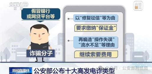 诈骗分子假冒银行或网贷平台等,发布“无抵押、秒放款”虚假广告,诱导受害人下载虚假贷款App或登录虚假网站。以“修复征信”等为由要求缴纳“保证金”,再编造“操作失误”“流水不足”等理由继续索要费用。骗取钱财得手后以新借口继续诈骗或直接失联。