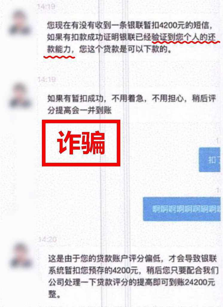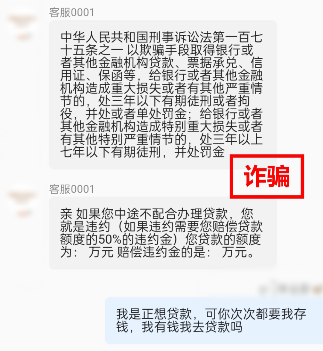 本来说好了,完成上述操作10分钟后款就贷下来了。但10分钟后,对方突然说小代评分还是差了一点:“担保金要达到贷款额的20%”。于是小代又凑了2000元,仍需分多个账户转出。这次小代终于警惕起来了,心想这不对啊,贷款平台是放款的,怎么一直变着法让自己转钱,而且自己一旦晚了点回复,对方就开始威胁自己要赔付违约金,小代反手就打了110电话核实,这才知道自己被骗。