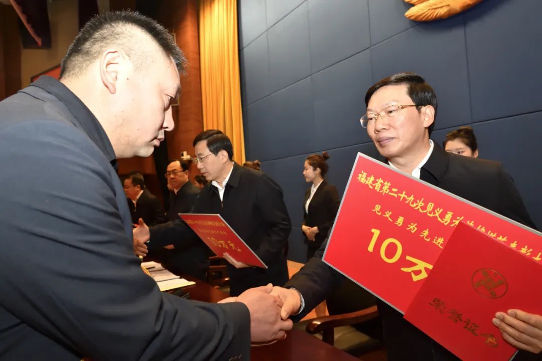 表彰会上,省人民政府授予蔡文等3人“福建省见义勇为英雄”荣誉称号,授予余深华等8人“福建省见义勇为模范”荣誉称号;省见义勇为人员奖励和保护工作委员会授予黄光忠等37人“福建省见义勇为先进个人”荣誉称号。对上述表彰人员按规定颁发奖励。