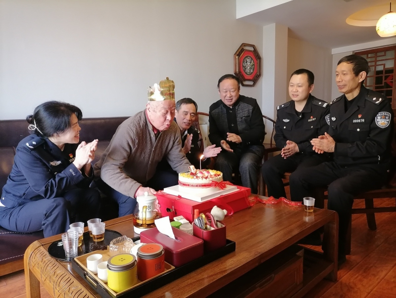 在胡老家中,大家欢声笑语,其乐融融。叶处长首先为胡老送上厅党委委员、政治部主任许标旗签名的生日贺信,离退处、技侦总队代表党组织和原单位送上生日蛋糕和水果,为其点燃蜡烛、戴上高寿帽,祝愿胡老生日快乐、福如东海、寿比南山!胡老在大家唱着生日祝福歌声中对着蜡烛许下自己的心愿和美好的期盼。