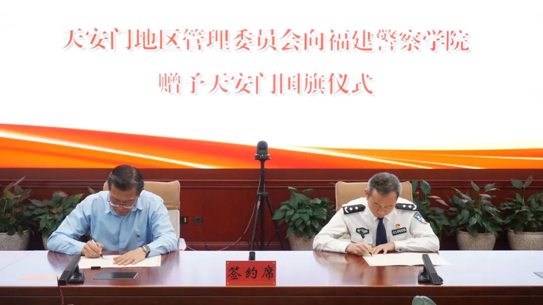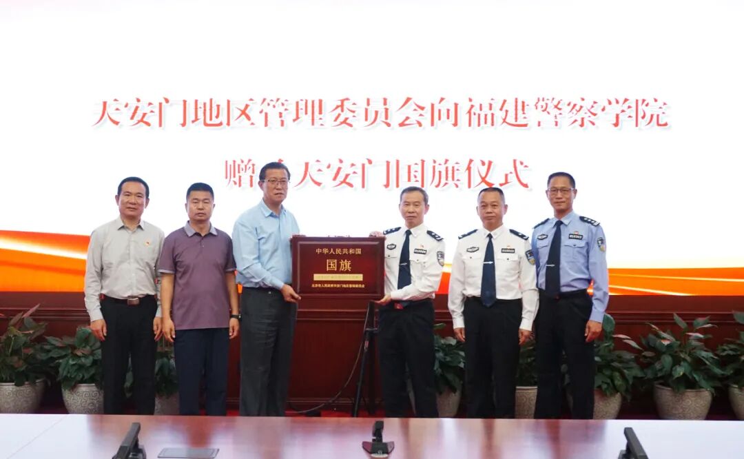 福建警察学院对天安门地区管理委员会的信任和厚爱表示衷心的感谢,介绍了学院办学历史和建设发展情况。福建警察学院表示,获赠这面在福建警察学院校庆日当天升起的国旗,对学院师生具有特殊的纪念和教育意义,将严格按照《中华人民共和国国旗法》,保管好、展陈好、使用好这面珍贵的国旗,让国旗精神在新时代公安教育事业中绽放新的光芒,为推动福建公安工作现代化、推进平安福建、法治福建建设、护航福建高质量发展,培养更多可堪大用、勇担重任的忠诚卫士。