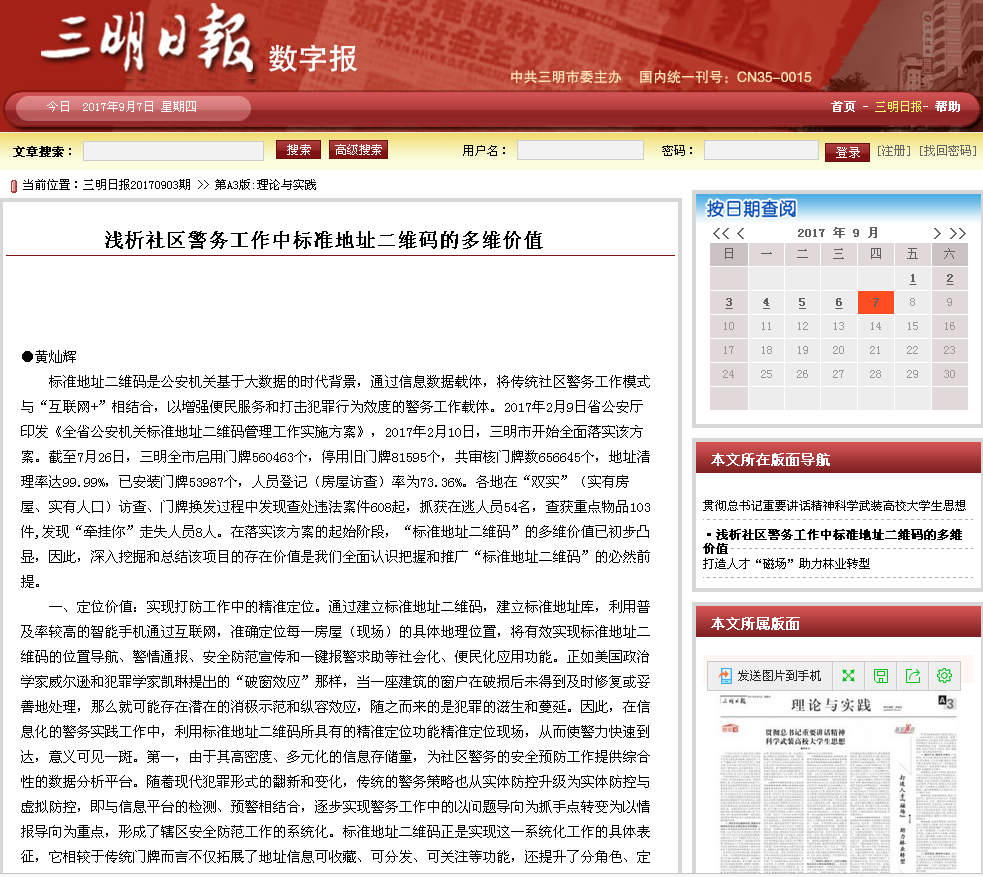2017年9月3日,《三明日报》A3版理论与实践以“浅析社区警务工作中标准地址二维码的多维价值”为题对标准地址二维码工作进行了报道。原文转载如下: